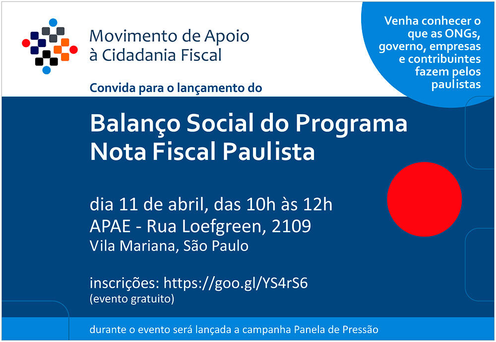 Atualmente, mais de 4 mil instituições recebem os recursos provenientes da Nota Fiscal Paulista, resultando em milhares de pessoas beneficiadas por projetos sociais, em milhões de atendimentos realizados todos os anos. Uma pesquisa feita pelo MACF, com 80 ONGs, revelará os benefícios sociais do Programa e será divulgada no próximo dia 11 de abril, às 10 horas, na APAE São Paulo.